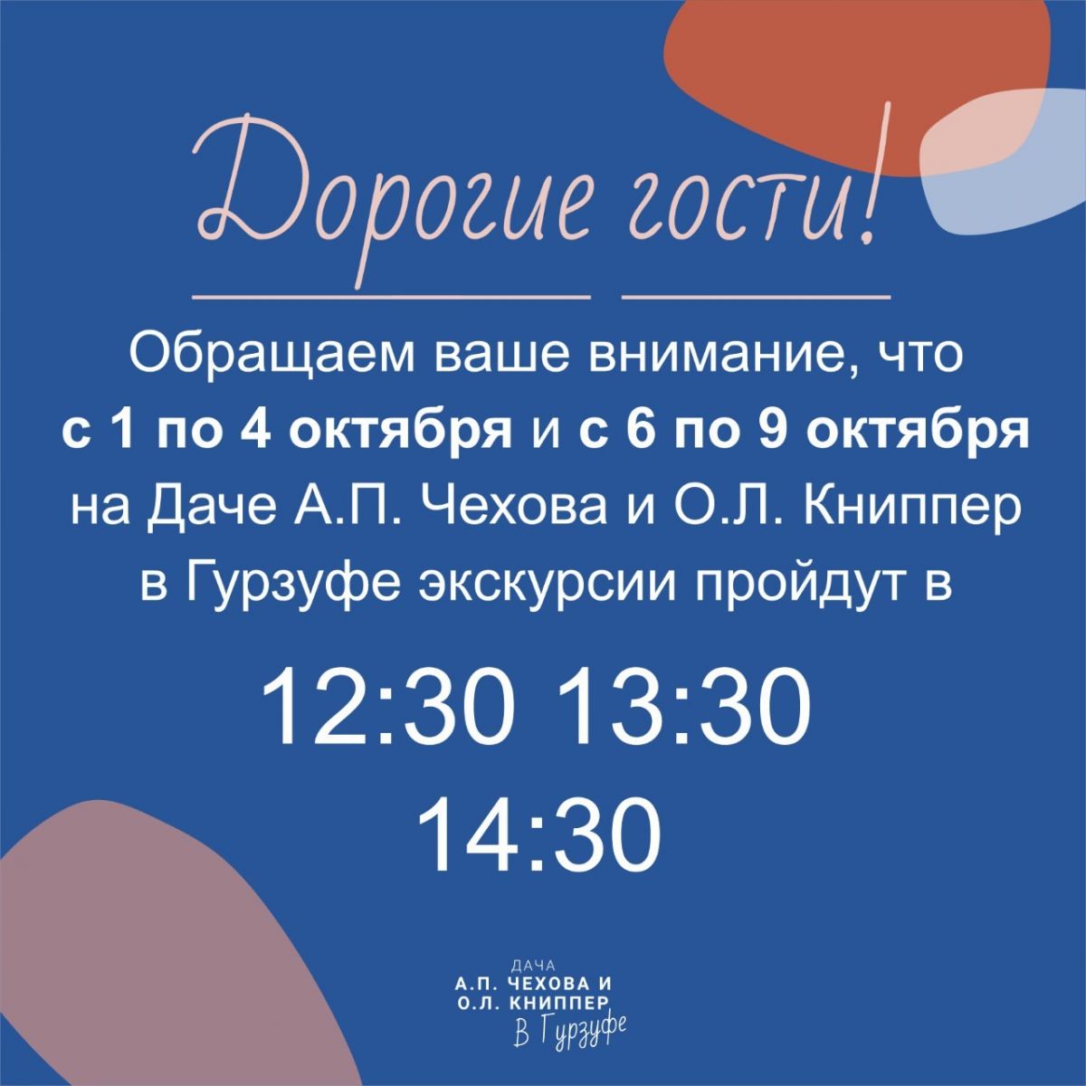Уважаемые гости! На Даче А.П. Чехова и О.Л. Книппер в Гурзуфе изменение в расписании экскурсий