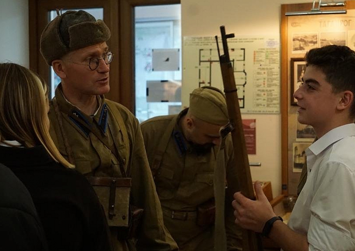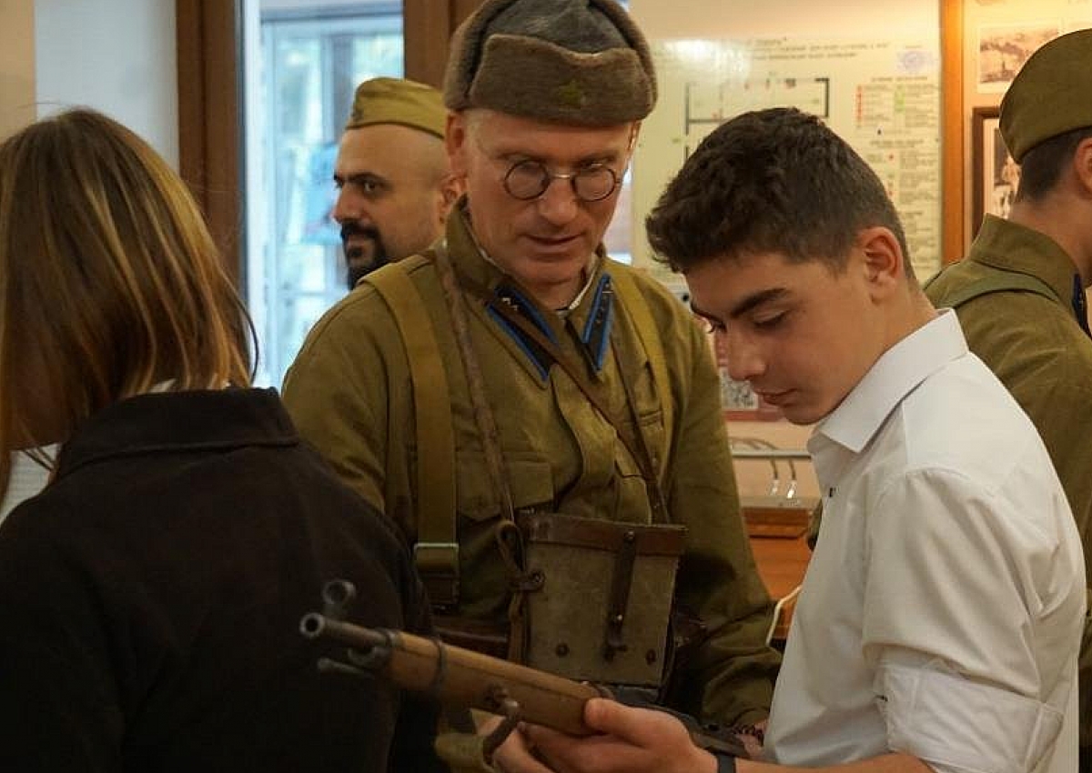 В рамках презентации фильма для учащихся старших классов Ялтинской средней школы № 4 была проведена лекция «Полезный разговор». Школьники получили уникальную возможность не только услышать о подвигах освободителей, но и вживую увидеть и прикоснуться к истории: им были продемонстрированы детально воссозданные форма и снаряжение солдат Великой Отечественной войны.