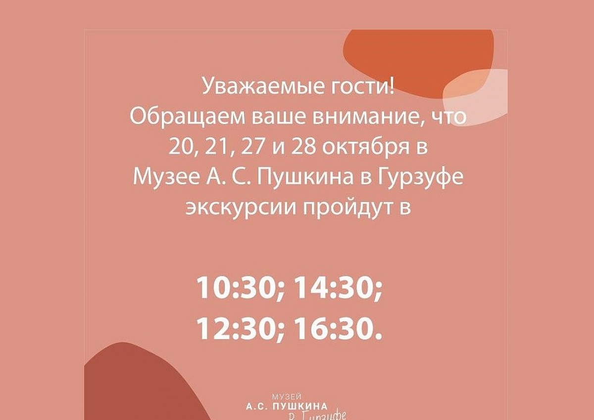 Обращаем ваше внимание, что 20 и 21, а также 27 и 28 октября в музее А.С. Пушкина в Гурзуфе экскурсии пройдут в: